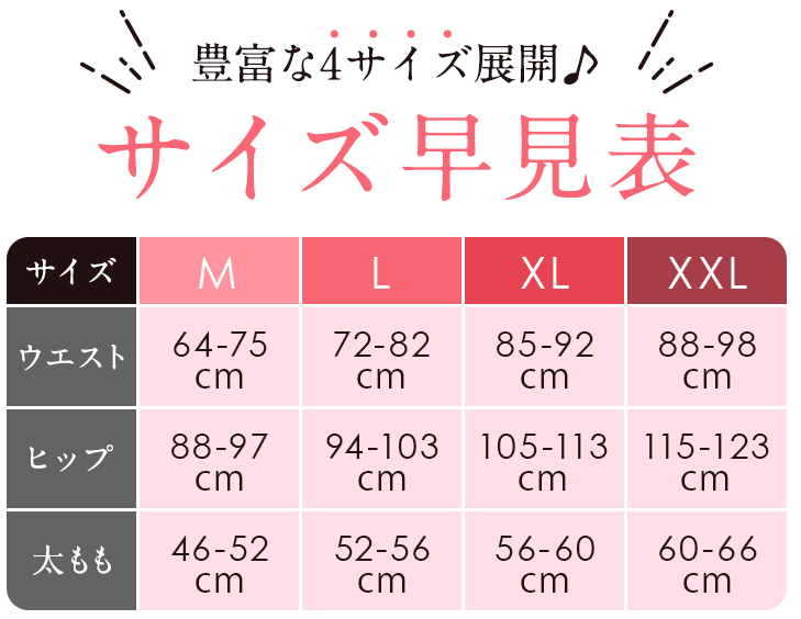 ウエストとヒップのサイズを正確に測り、公式サイズ表と照らし合わせることでジャストフィットのマジカルシェリーを選びましょう。
